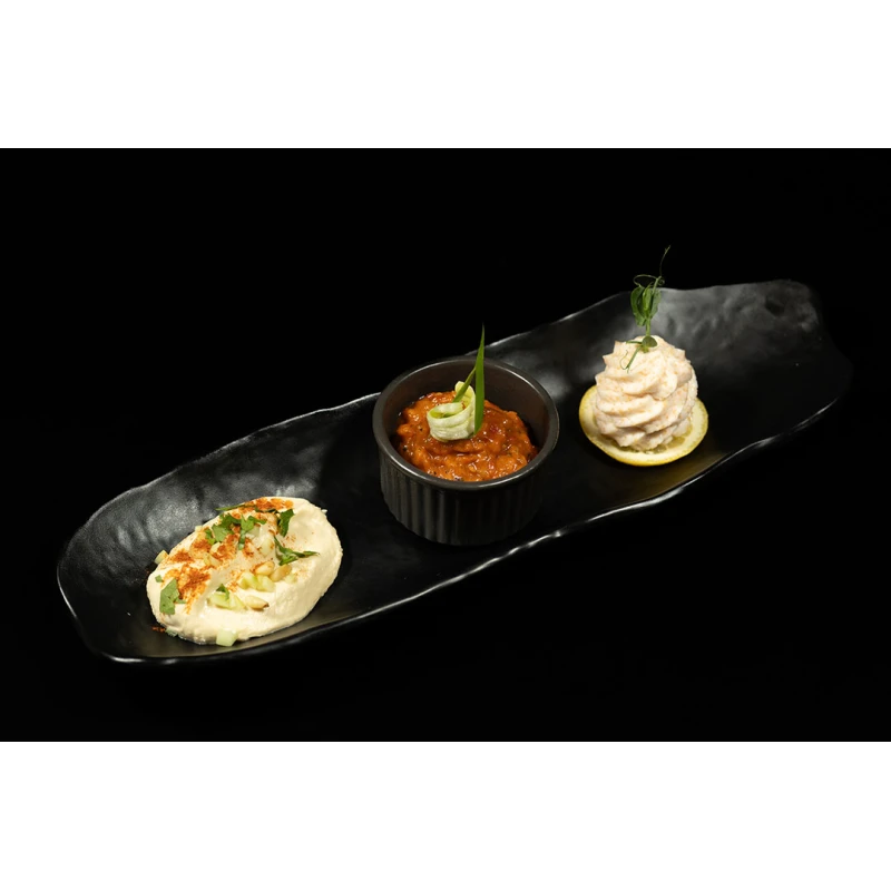 (mouse de foie gras, brânză de capră, file de păstrăv fume, hummus)