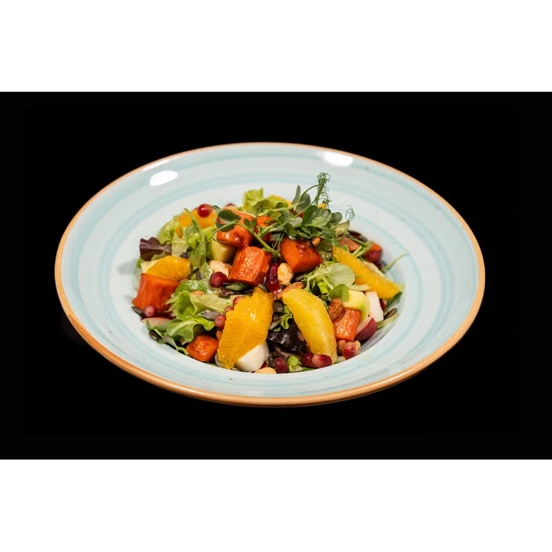 mix de salată, mango, rodie, nuci caju, migdale, morcovi caramelizați